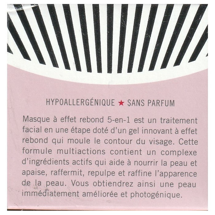 5-in-1 Bouncy Mask is a single step "facial in a jar" that features an innovative bouncy gel texture that molds to the contours of the face. This multi-tasking formula contains a complete of active ingredients that help to nourish skin and calm, firm, plump and refine the look of skin, giving it an immediately perfected, camera ready appearance.